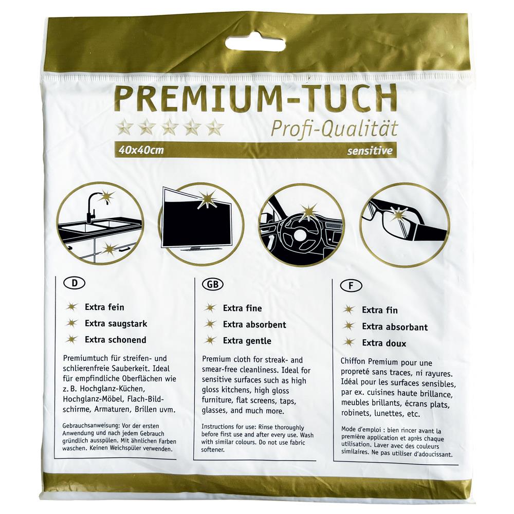 Premium-Tuch für streifen- und schlierenfreie Sauberkeit. Ideal für empfindliche Oberflächen wie z. B. Hochglanz-Küchen, Hochglanz-Möbel, matte Küchen- und Wohnmöbel, Elektrogeräte, Armaturen u.v.m.